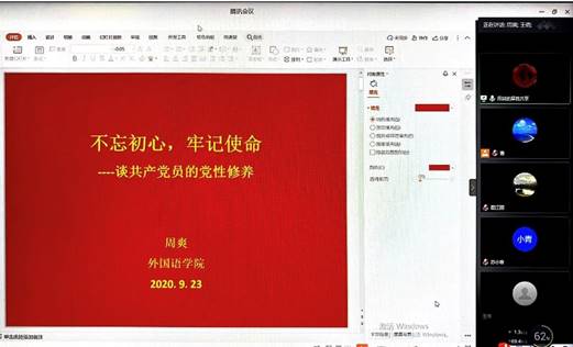 樱花动漫 副院长周爽为大学英语教学部党支部讲授党课 9月23日晚上,樱花动漫 副院长周爽在线上为大学英语教学部党支部讲授题为《“不忘初心、牢记使命”——谈共产党员的党性修养》的党课。