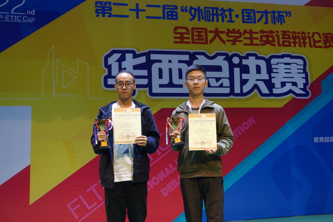 2019年3月30日至31日,在四川师范大学举办的第22届“外研社•国才杯”全国大学生英语辩论赛华西地区总决赛中,由我校大学生英语创新实践基地指导教师高㛃老师带队指导,我校理学院2016级学生李峻有和自动化学院2017级学生周靖皓荣获一等奖,并双双取得“最佳辩手”称号。本次比赛吸引了华西地区众多高校参与,辩才济济,强手林立。西安交通大学,四川大学,陕西师范大学等知名院校均派出了实力强劲的辩手。比赛采用英国议会制辩...
