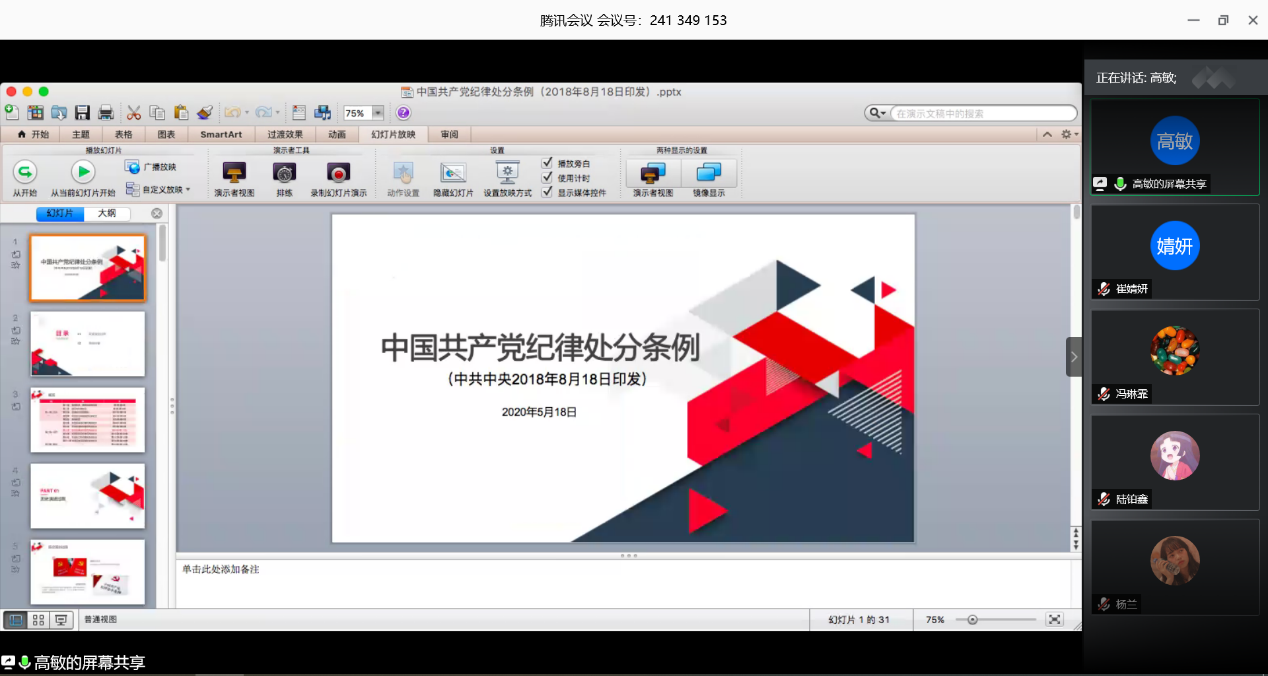 5月19日中午,樱花动漫 开展了第十三期发展对象培训班第5次线上党课。院党委副书记高敏为樱花动漫 发展对象讲述了“中国共产党纪律处分条例及廉洁自律准则”的专题党课。高敏从大学日常生活中的点滴事件入手,通过在学习评优、班级工作等方面设定各种情况,引导同学们展开关于廉洁诚信的讨论和思考,鼓励同学们针对不同的情况积极发言,阐明自己的观点和想法。她首先从中国古代文化的角度解释了廉洁的含义:不受曰廉,不污为洁。接...