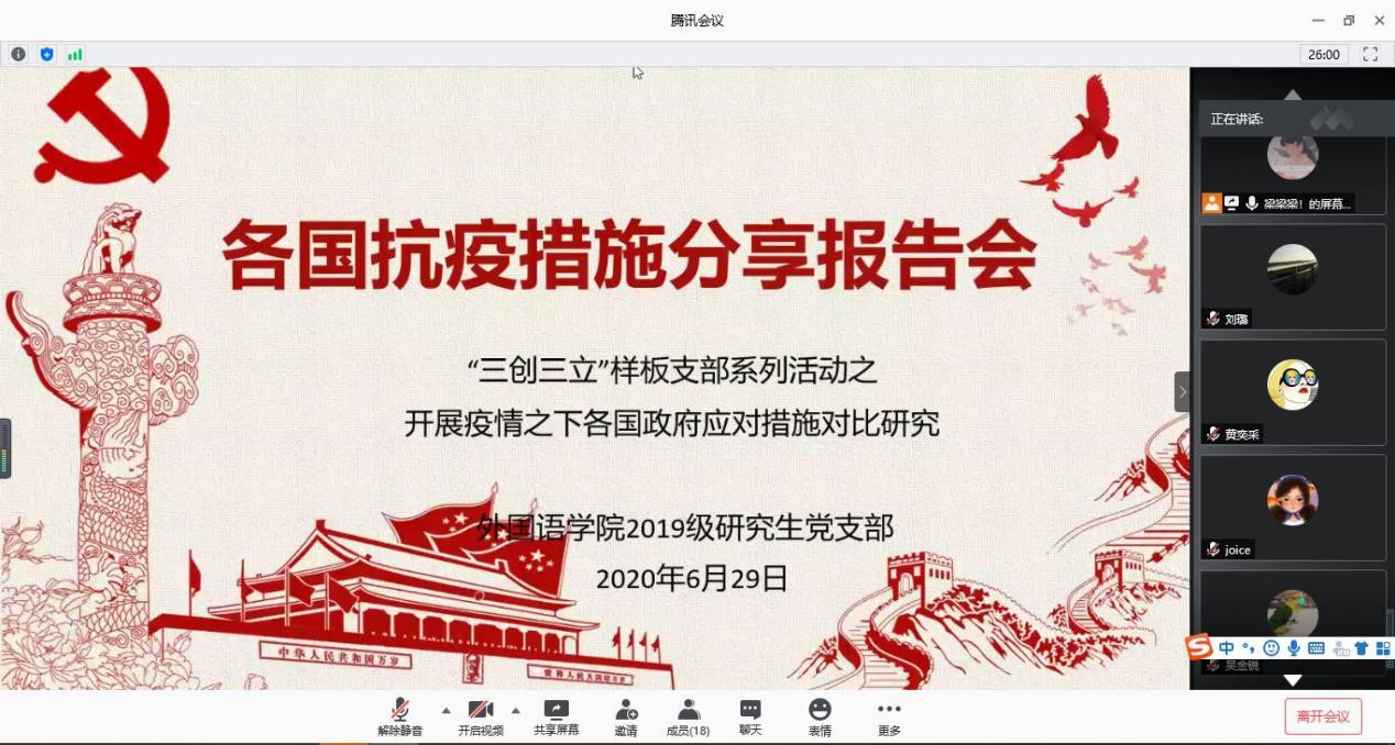 6月29日晚8点,樱花动漫 2019级研究生党支部与外国语言文学党支部结对子通过腾讯会议APP开展了“各国抗疫措施分享报告会”党日活动。本次活动是樱花动漫 2019级研究党支部“三创三力”样板党支部创建过程中的一个环节。前期,在结对共建党支部老师们的悉心指导下,学生党员们对各国抗疫措施的资料进行了搜集、整理与分析,并在本次会议做了逐一汇报。朱思维与蒋晨在麻蕾老师的指导下对中国抗疫措施进行分析,主要从医疗、教育...