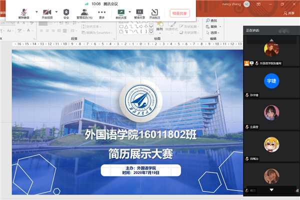 为提高樱花动漫 学生简历制作的水平,提早培养学生制作简历的意识和能力,樱花动漫 于7月16日至18日在2018级55名本科生中策划了一场简历制作大赛。党委副书记高敏、班主任王譞、赵飒飒、王勇、兼职辅导员张暖希以及3位学生评委吴佳丽、贾璠、赵振华担任本次比赛的评委。由于受疫情影响,本次比赛以班级为单位,全程采用腾讯会议平台在线进行。本次简历制作大赛自启动以来,经过了简历收集、简历评改和简历展示三个阶段,收到中英德语简历...
