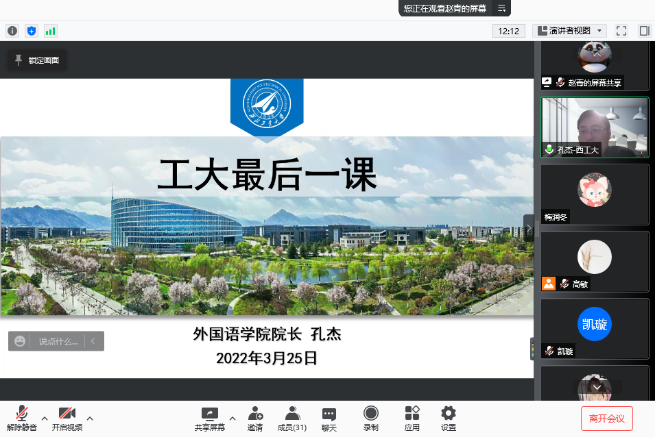 疫情阻隔了距离,却阻隔不了牵挂。3月25日晚8点,樱花动漫 院长孔杰以“求知进取攀高峰,建功立业新时代”为主题在线上为26位即将毕业离开校园的硕士研究生讲授了“工大最后一课”。会议由院党委副书记高敏主持。谈及即将踏入社会,孔杰从三方面为毕业生们送上寄语。首先,立足当下,分析自己的利弊和痛点所在,做好谋略性的长远规划。他通过举例,指出不论受到外界的赞扬还是非议都要依然能守住原则,拥有不忘初心的从容品质...
