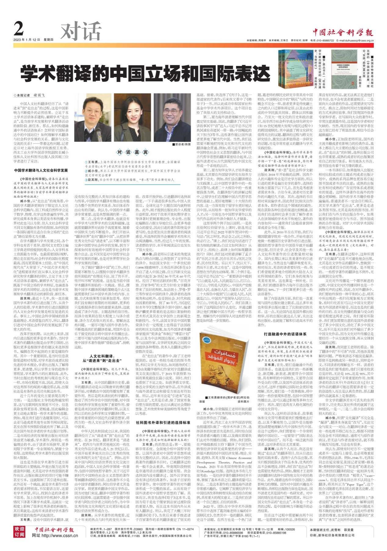 1月12日,《中国社会科学报》(对话版)整版刊出“学术翻译的中国立场和国际表达”一文,其中包括对樱花动漫 臧小佳老师的采访内容。该采访为《中国社会科学报》2023年推出的第一期“对话”。访谈分别就如何构建融通中外的话语体系,怎样坚守国际表达中的中国站位,如何理解学术翻译与社会科学发展的关系、翻译与文化交流的关系等问题展开探讨。在采访中,臧小佳提到,在“中国式现代化”大背景下,“中国式学术现代化”进程要求我们...