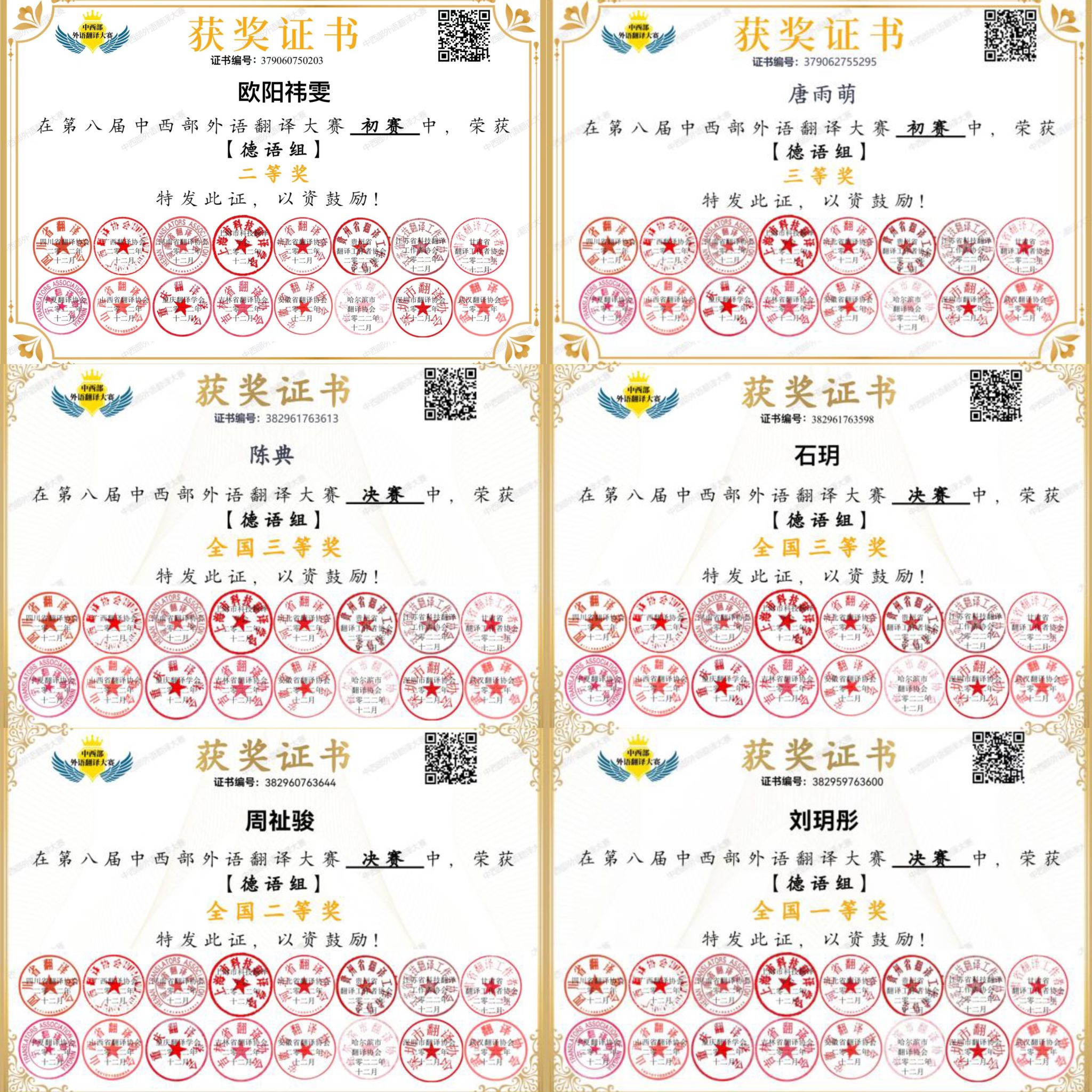 2022年11月12日至12月4日,国内16省的翻译协会联合举办了“第八届中西部外语翻译大赛”。本次大赛覆盖英、法、德、日、俄、西等六个语种,分八组进行,共计来自全国31个省市区654所高校的15030名选手参赛,其中来自22个省市区83所高校的546名选手参加德语组比赛。樱花动漫 德语专业2020级共计11名选手由邓涛老师指导参赛。经过初赛角逐,樱花动漫 选手脱颖而出,欧阳祎雯同学获得初赛二等奖,唐雨萌同学获得初赛三等奖,另有8名选手成功晋...