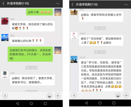 在教东和教西有教学任务的教师所在教室进行了“暖心茶点”投递。由于很多老师非常爱岗敬业,早早就抵达教室做课前准备工作,亲手收到“暖心茶点”后都很意外和感动。很多当时没有碰面的老师后来也通过社交媒体发出了反馈。从10月15日周一中午开始,各位老师分别通过学院微信群和私信的方式对本次活动积极表达了肯定,感谢了学院党委对广大教师的关怀和对支部服务项目的倡议与指导,也对文学系支部的具体工作实施进行了集体点赞和热情鼓励。