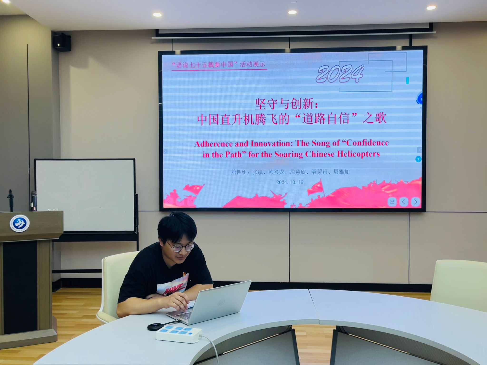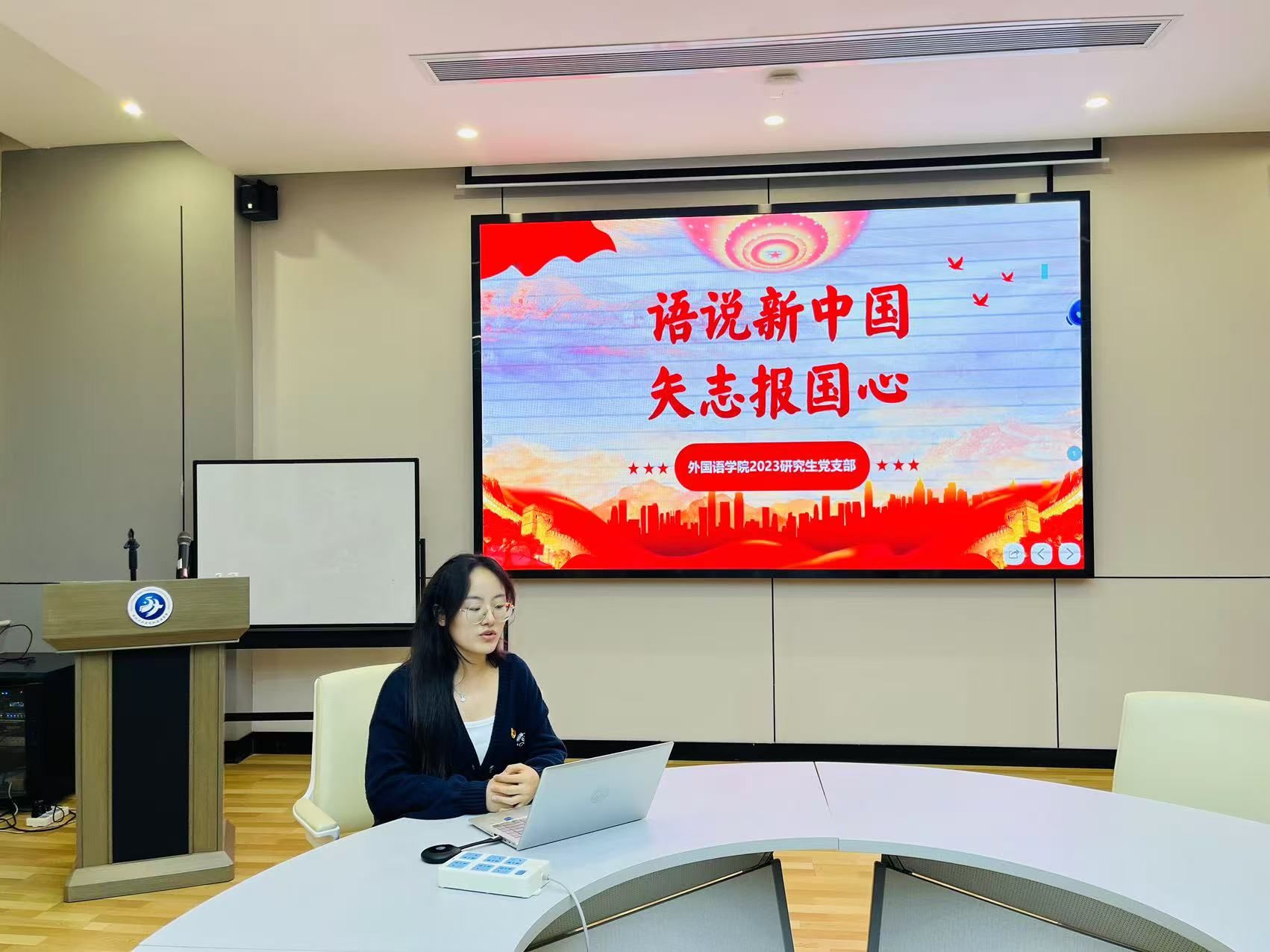 为庆祝新中国成立75周年,深入学习领会学校第十四次党代会精神,践行新时代外语青年讲好中国故事使命,10月16日,2023级研究生党支部于学院204会议室举办“语说新中国•矢志报国心”主题党日活动。本次活动以“四个自信”为主题,以工大人矢志报国的故事为线索和载体,在学习和讲述中进一步领悟学校“总师育人文化”内涵。活动由支部书记蔡欣雨主持,支部全体党员及积极分子参加。经过前期的筹备与讨论,活动以分组汇报的形式开展,以英语或德语讲述工大人的故事。