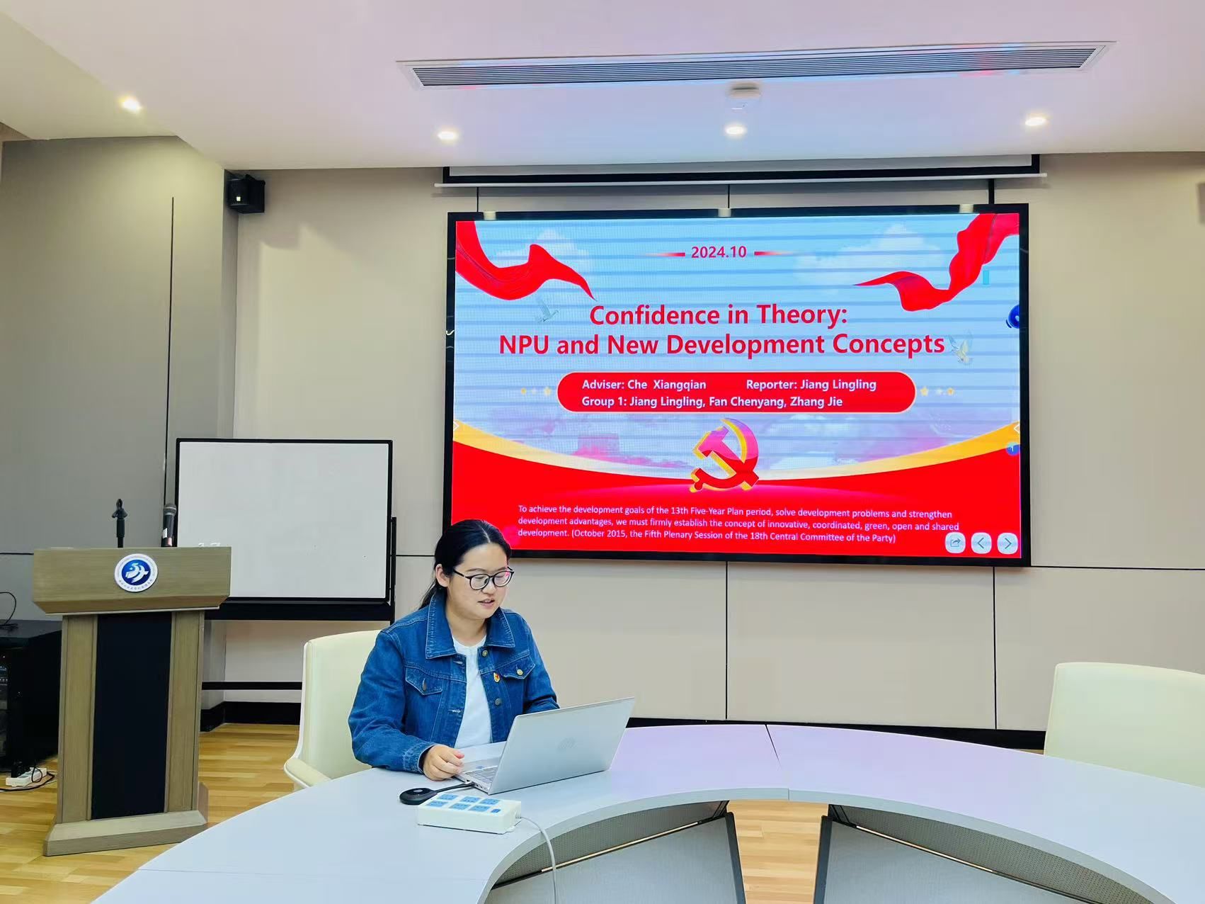 江玲玲同志聚焦“理论自信——西工大与新发展理念”,以一批西工大人践行“创新、协调、绿色、开放、共享”新发展理念的实践为例,展现了学校在培养“总师型”人才、推动高质量发展方面的成就。在外国语言学文学系党支部车向前老师的进一步指导下,江玲玲同志和另外两位同志荣获学院“语说七十五载新中国”活动二等奖。