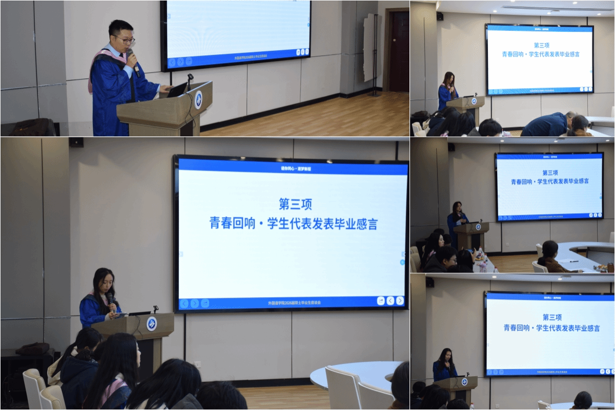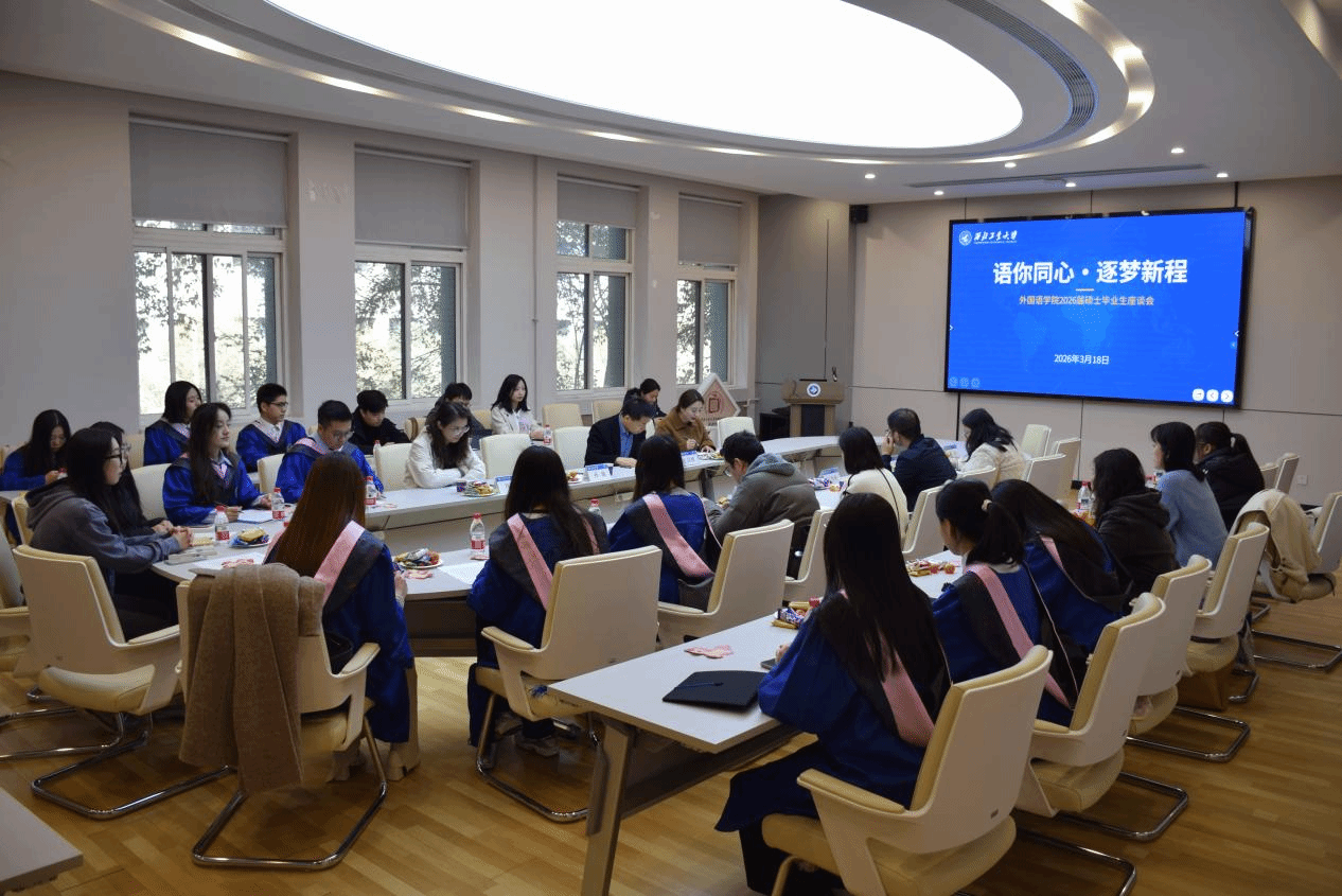 此次毕业座谈会为2026届硕士毕业生的校园时光画上了圆满句号,也为学子们奔赴人生新征程注入了温暖力量。未来,学院将继续坚守育人初心,搭建毕业生与母校、老师的沟通桥梁,持续传递关怀与期许。愿全体毕业生带着学院的祝福,以青春之姿奔赴山海,以专业之力赋能成长,在各行各业坚守外语人的使命与担当,逐梦新程、不负韶华。(文稿:杨子涵;图片:郝子赫;审核:张桑桑)