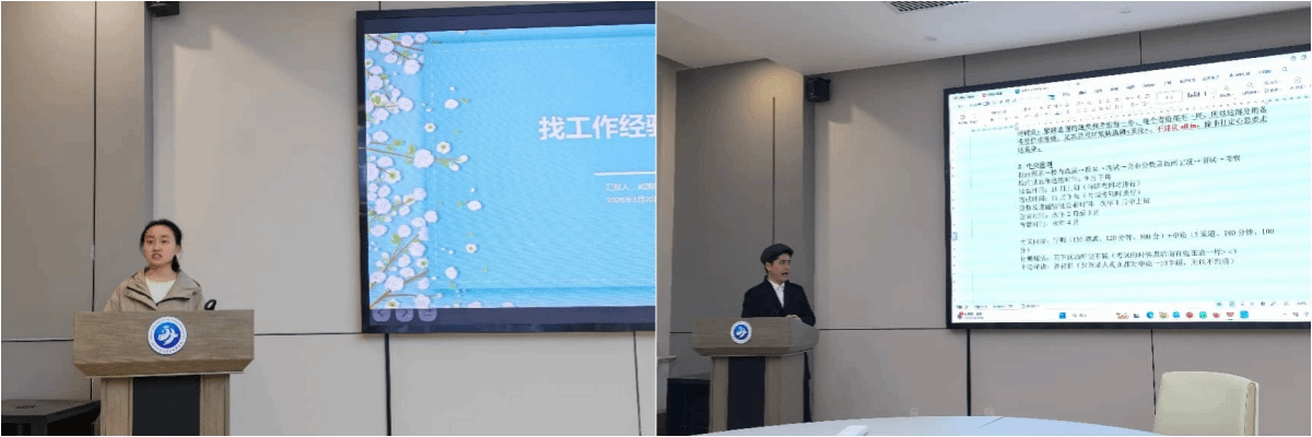 武国叶围绕考公考编及军队岗位的报考经验展开分享。她详细介绍了军队文职等特殊岗位的招考流程、备考要点以及职业发展前景,拓宽了同学们的就业视野,为大家提供了多元化的职业选择思路。蒲增结合自身备考经历,系统分享了考公考编的备考策略与应试技巧。他从岗位选择、时间规划、笔试准备到面试环节进行了细致讲解,为有志于进入体制内的同学提供了切实可行的参考。