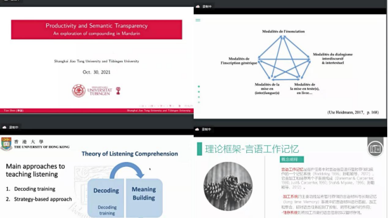 论坛的主题发言环节,四位青年学者依次从各自的研究领域出发分享了最新的学术成果,分别作了题为“基于现代汉语双字形名复合词的形态能产度与语义透明度研究”、“探究英语听力学习中单词识别训练的设计理论”、“从‘差异化比较研究’的角度看中法童话的文类问题”、“工作记忆与德汉笔译速度和质量的关联性研究”的学术汇报。与会专家与学者从不同学科领域进一步积极交流和深入探讨,再次拓宽了科研视野,增强了了解和合作。本次论坛探讨的研究方向覆盖语言学,外语教育,比较文学和翻译学等,也是“新文科”背景下外语学科发展的主干学科领域。