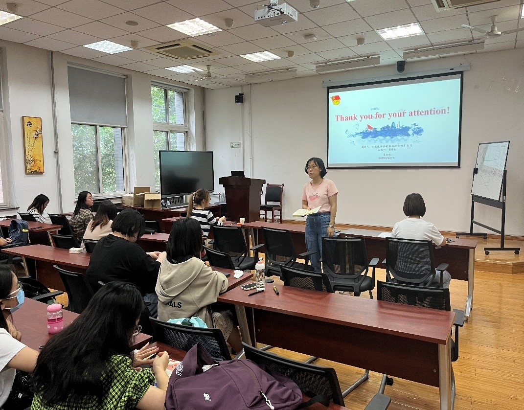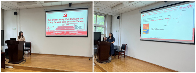 第六组吴倩、邹祺葳以学习外国文学为例从认知、情感、意志和行为四个层面向学员们汇报了外语学习的过程,从而分析了英语专业大学生用外语讲好中国故事,必须先从培养爱国情怀做起,再将情怀转化为实践。