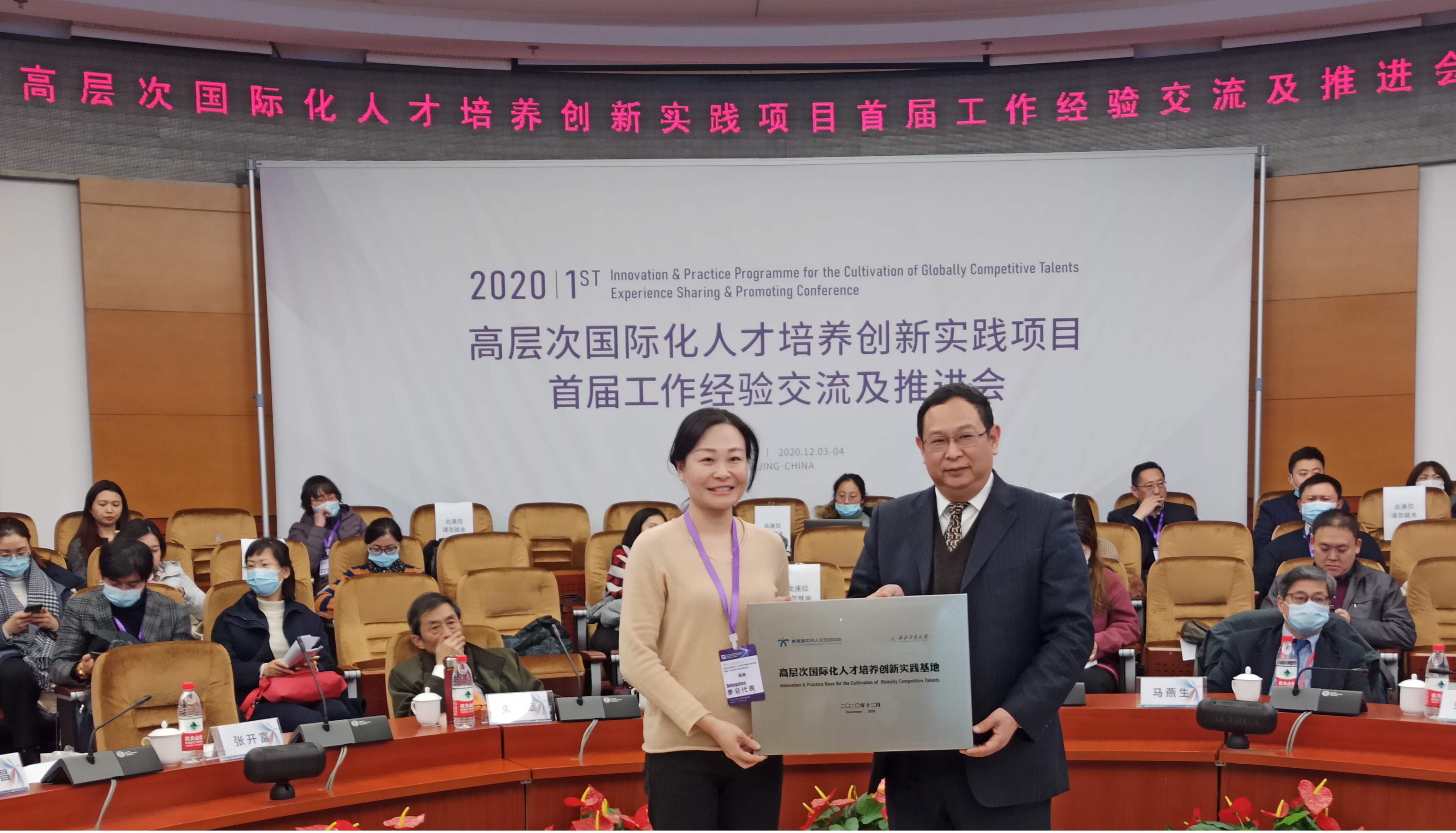 本次会议还为首批立项高校举行了“高层次国际化人才培养创新实践基地”授牌仪式。教育部中外人文交流中心副主任杨晓春做了大会总结,对基地建设提出了相关建议和要求。