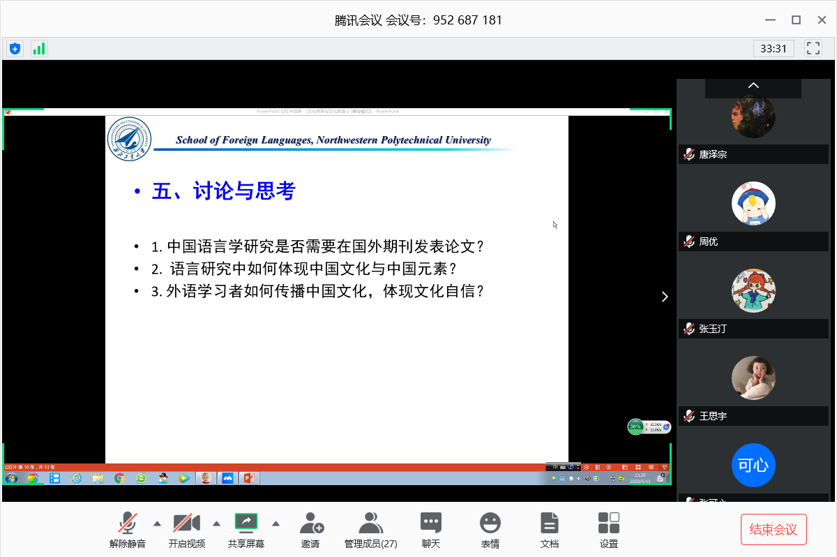 党课伊始,张奕向大家提出了三个问题,“中国语言学研究是否需要在国外期刊发表论文”、“语言研究中如何体现中国文化与中国元素”和“外语学习者如何传播中国文化,体现文化自信”。三个问题贯穿本次党课始终,给每位发展对象都带来了深入的思考。过程中,张奕与在线同学积极互动,学生参与感强,在讨论中获得了新的认识。