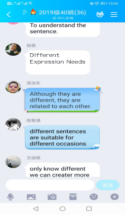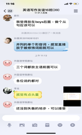 研究生任课教师立刻着手测试线上教学平台,经过雨课堂、腾讯会议等各种尝试后,发现QQ直播因其操作简单,互动性强而更具优势。用好授课平台,强化学习效果。任课教师提前到课,通过QQ自带的“作业”功能,在课堂上用简短的一句英文对学生进行小测验,在起到督促作用的同时,也提高了学生的写作能力;在讲授英语句子类型时一边讲解一边辅助不同句子和图示,清晰明了;通过同一现象句子罗列,引导学生自己归纳,进而发现句子内在规律,充分调动学生认知掌握知识;将学生分小组进行讨论,锻炼彼此之间的组织配合能力,调动课堂的学习氛围。