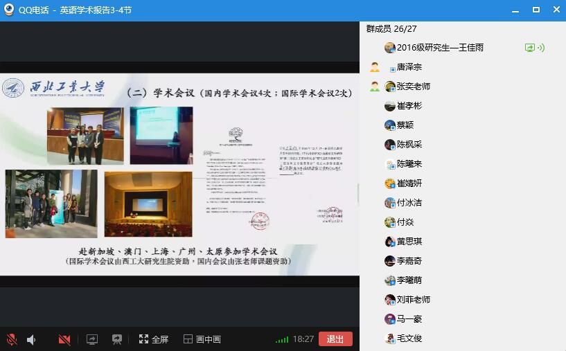 2016级外国语言学及应用语言学研究生王佳雨在线分享了自己在西工大读研的感悟,可概括为“滋养”,“求真”和“定力”。她还从导师指导、学院支持、学校平台三个角度回顾了工大读研的成长经历,引发了与会同学们的思考与共鸣。