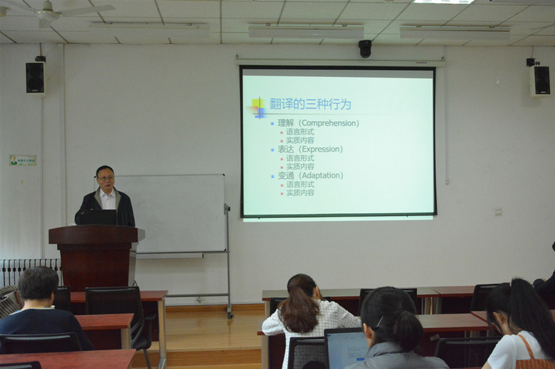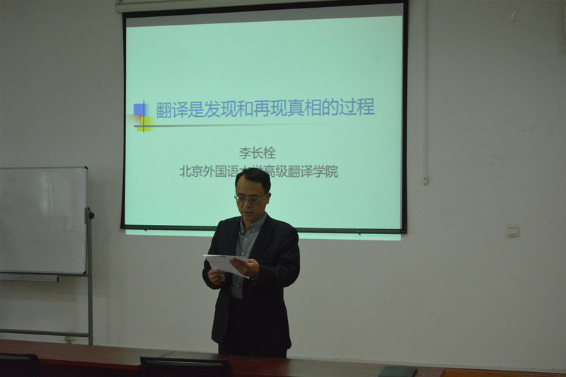 张文涛介绍了李长栓的学术经历和研究方向并对其到来表示欢迎。随后,在报告中,李长栓讲到译者要利用宏观思维、逻辑思维、批判性思维和调查研究,发现作者意欲传递的主客观事实,并以适当方式再现这些事实,必要时对原文内容进行变通。他认为做好翻译需要达到以下三点:理解要接近、达到甚至超过原文作者的水平;表达作者清楚表达、希望表达、应该表达的意思;译文表达形式与原文相同、相近或完全不同。整场报告,他用具体的事例论证,生动形象,详细解说翻译是发现文字背后意图和事实真相的过程,让每个学生受益匪浅。