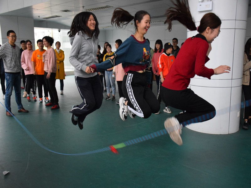 趣味运动设置有传动呼啦圈、障碍跑、篮球接力、撕名牌、五人六足、拔河和跳大绳等考验默契度的团队运动项目。比赛以班级为单位,采取积分制,其中学工组队伍可随机挑战每个环节的获胜班级。