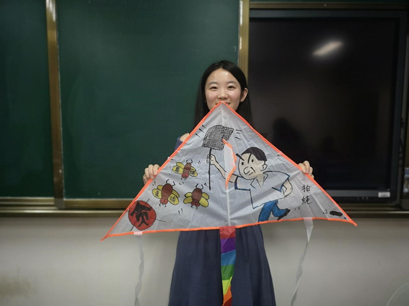 来自电子信息学院的朱星星举起风筝,介绍了自己创作的初衷:“围绕‘廉洁诚信’这一主题,以‘基层反腐’为中心绘制了题目为《拍蝇》的作品。图中‘苍蝇’象征着基层腐败人员,挥着‘拍子’的‘人’代表以习近平同志为核心的党中央。左下方的标志重在强调反腐的决心,表明乱飞的‘苍蝇’必须拍,要集中力量反腐,推动从严治党向基层延伸!”