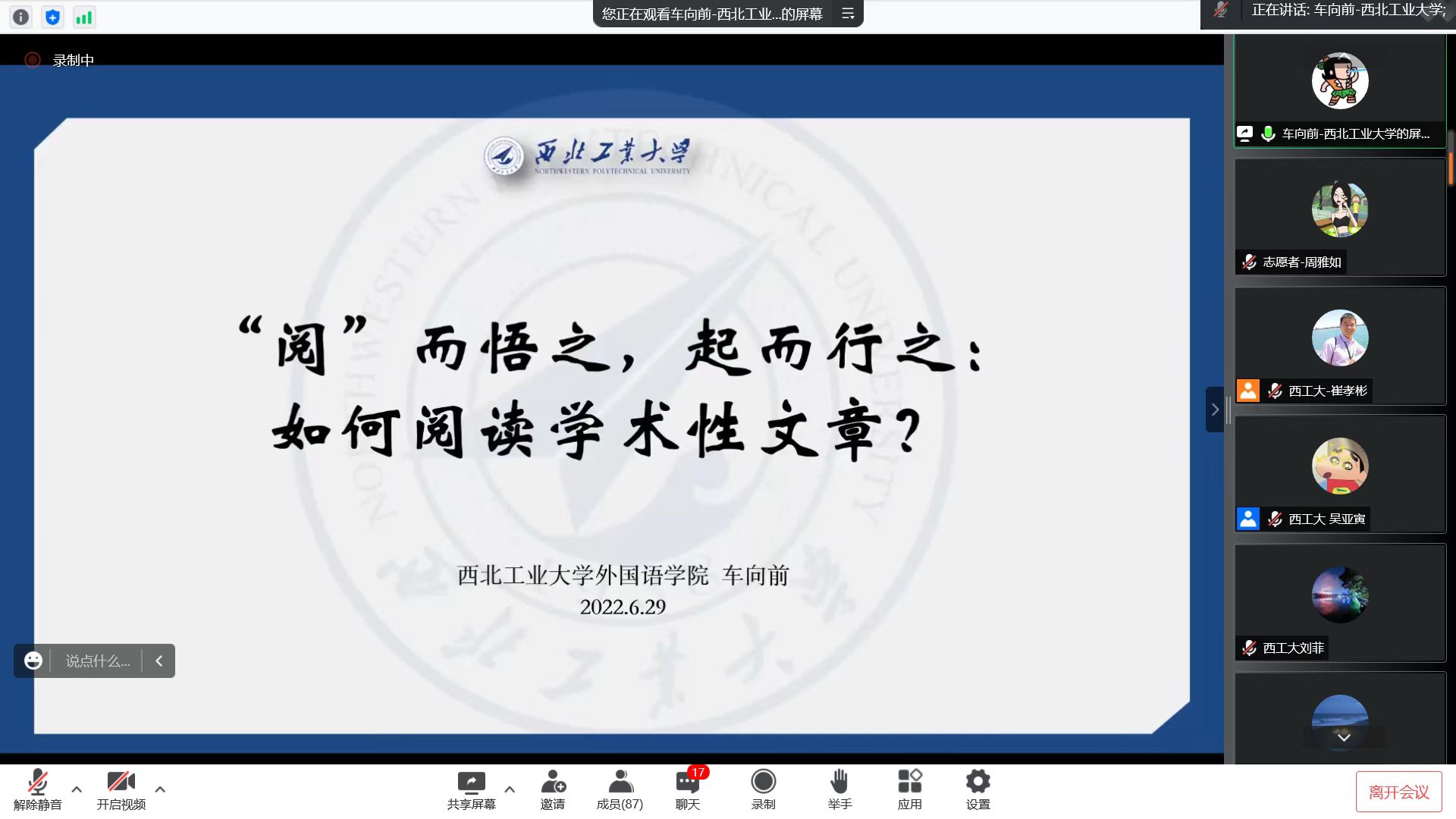 下午,院党委副书记马颖介绍学院学生工作,重点从奖学金、助学金、勤工助学等方面做了讲解。随后,学院开展了研究生毕业生分享会和在校生学习经验交流会。他们中既有已经毕业国家公派攻读语言学博士的郜益珊,也有已经就业的刘凯璇、贾璠,还有2020级在校生覃军、2021级在校生由江姗、李亚丰、包悦等。他们依次从不同的角度、有侧重地分享了各自的研究生生涯及西工大、樱花动漫