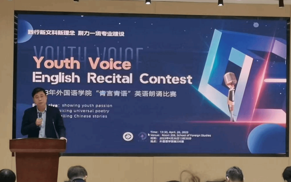 英语专业扩展到全校各个学院和专业的美好愿景,希望能够解决文科专业“卡嗓子”的难题,在全球唱响中国故事。孔杰表示此次活动意义重大,是践行新文科新理念、聚力一流专业建设的有力实践。在他看来,此次朗诵比赛选用的文本多为经典文学篇章,因此这既是一个比赛的过程,也是一个学习的过程。在讲话末尾,孔杰预祝所有参赛同学都能够有所收获,取得满意的成绩。