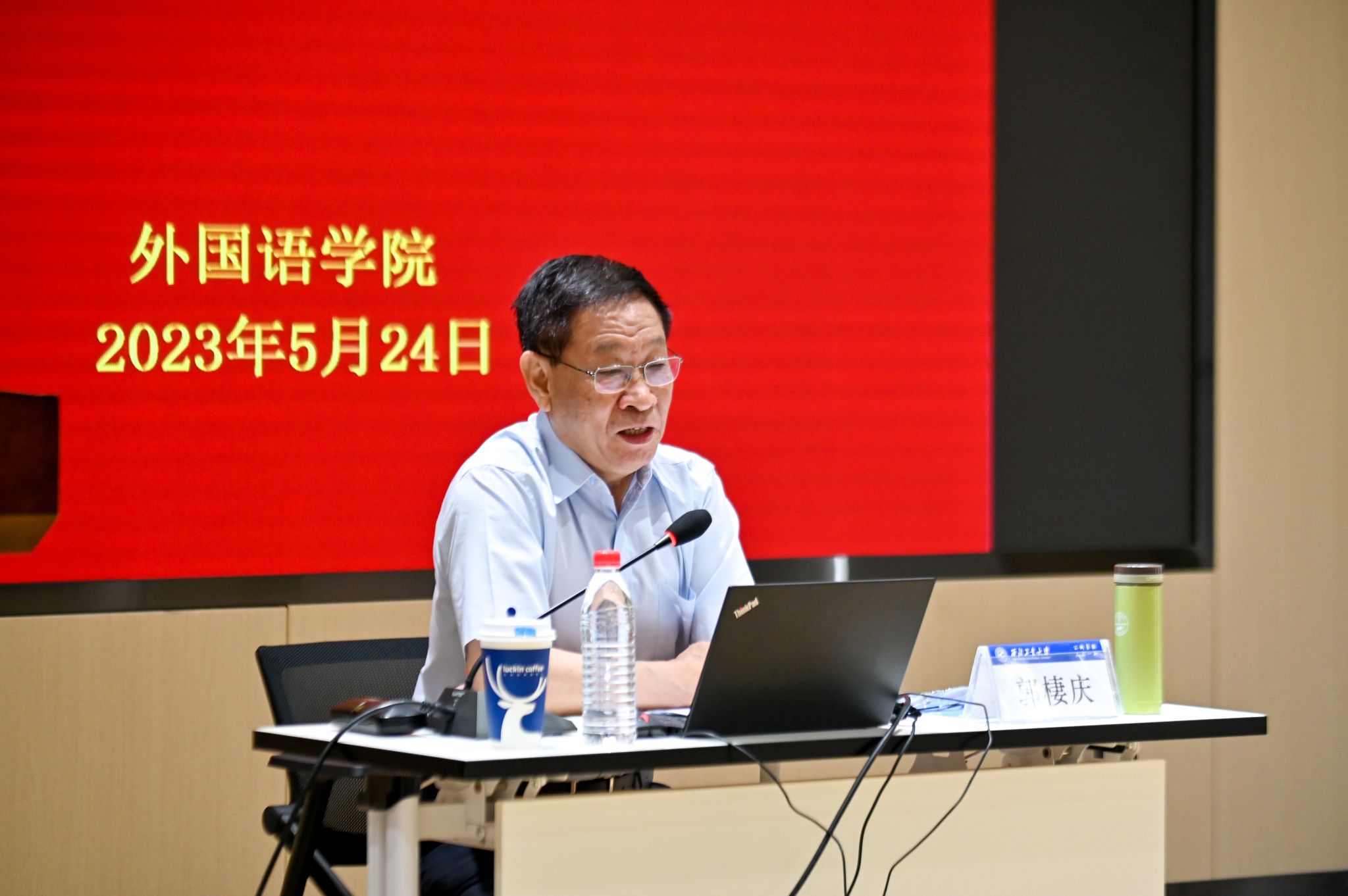 讲座主要围绕“学好外语”展开。郭教授从自己与西安的缘分讲起,逐渐拉近与同学们的距离。他援引习近平总书记和周恩来总理对英语专业学生的期待,提出英语学习者要注重培养专业本领、家国情怀和全球视野,用外语传递中国思想、中国声音和中国方案。随后,郭教授结合自己从学生成长为英语教师过程中与英语“相爱相杀”的经历,强调学习英语要有动力、掌握规律、讲究方法。一是要有学习动力,兴趣和需求缺一不可;二是要树立自信心和保有危机感;三是听说读写译是有机整体,须同步提升,不可偏废;四是要将语言学习和文学相结合;五是要将苦学与巧学相结合,尽可能利用条件和机会接触英语、感受英语。最后,郭教授寄语同学们要学好外语、用好外语,心系民族国家,服务人民。