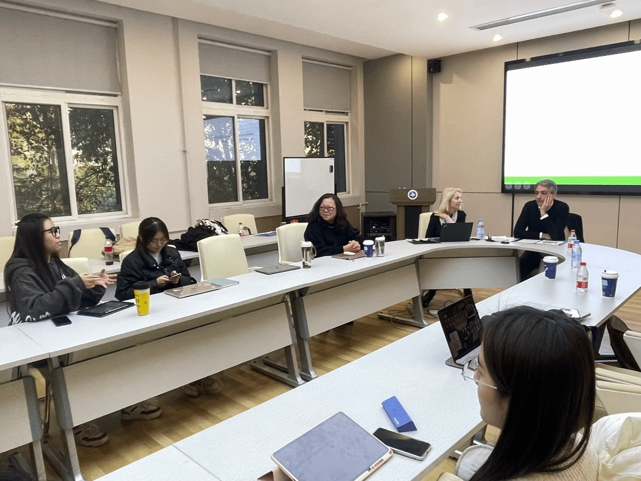师生面对面进行了深入交流。学院研究生导师在外语专业教学与新技术融合及人才培养方面作了实践教学经验分享;同学们也从研究背景、内容及方法论等角度出发,积极向两位英方老师探讨学习。研讨会氛围轻松愉快,双方就中英学术前沿问题展开了热烈讨论,碰撞出思想的火花。