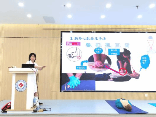 活动伊始,王治荣结合实际案例,带领同学们深入了解并认识急救的重要性,并提出“黄金四分钟”,时间就是生命的概念。随即从心肺复苏术,AED的使用,海姆利克急救法三方面展开具体讲解。