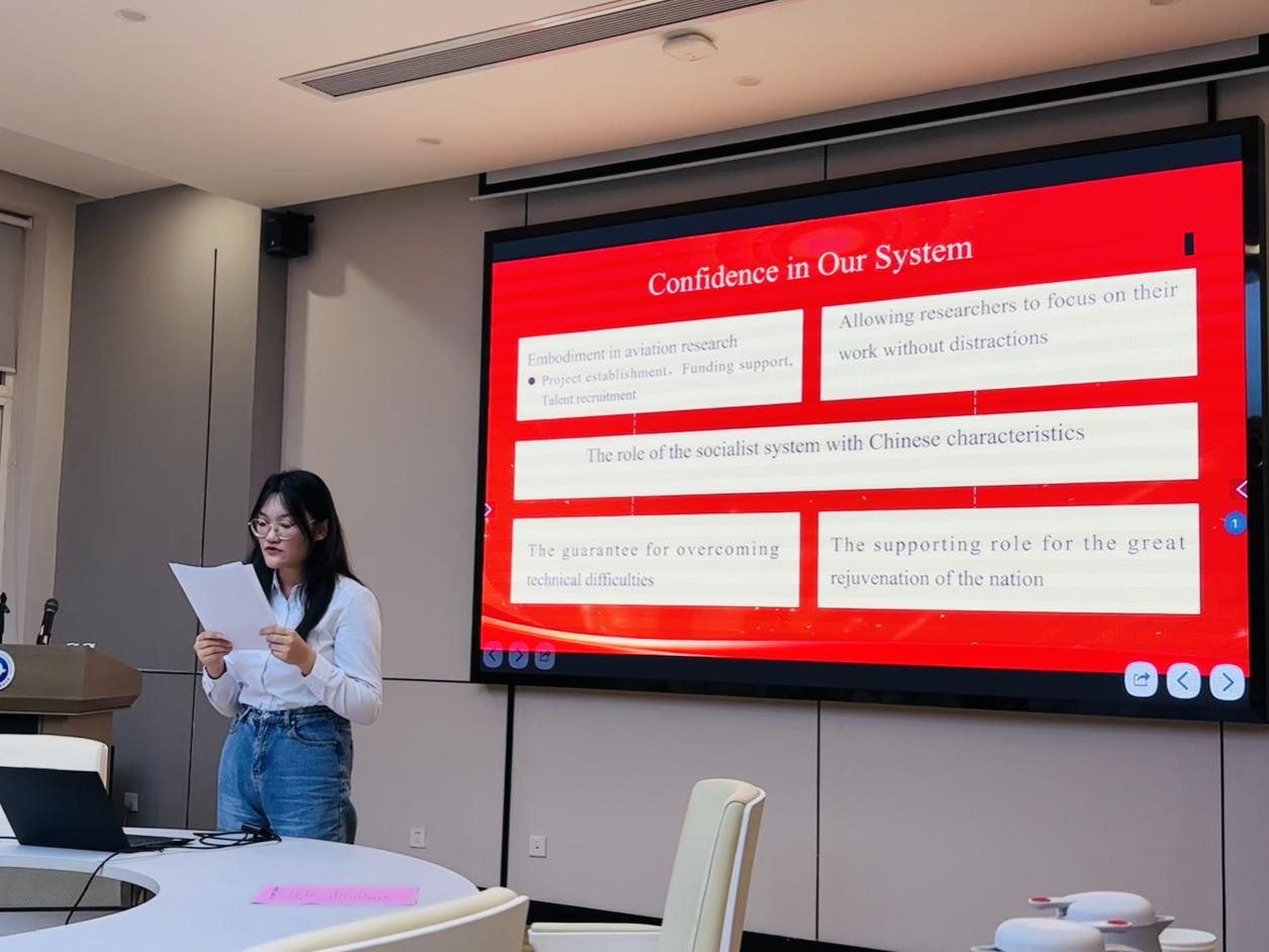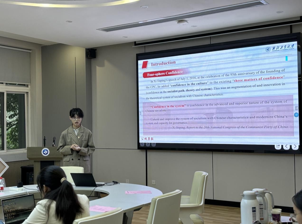 随后,按照抽签顺序,6组同学按照依次上台进行汇报展示。各组同学以中华人民共和国七十五周年的光辉历程为素材,以故事为线索,熟练运用英、德2种语言,深刻阐释“四个自信”的丰富内涵和重大意义。