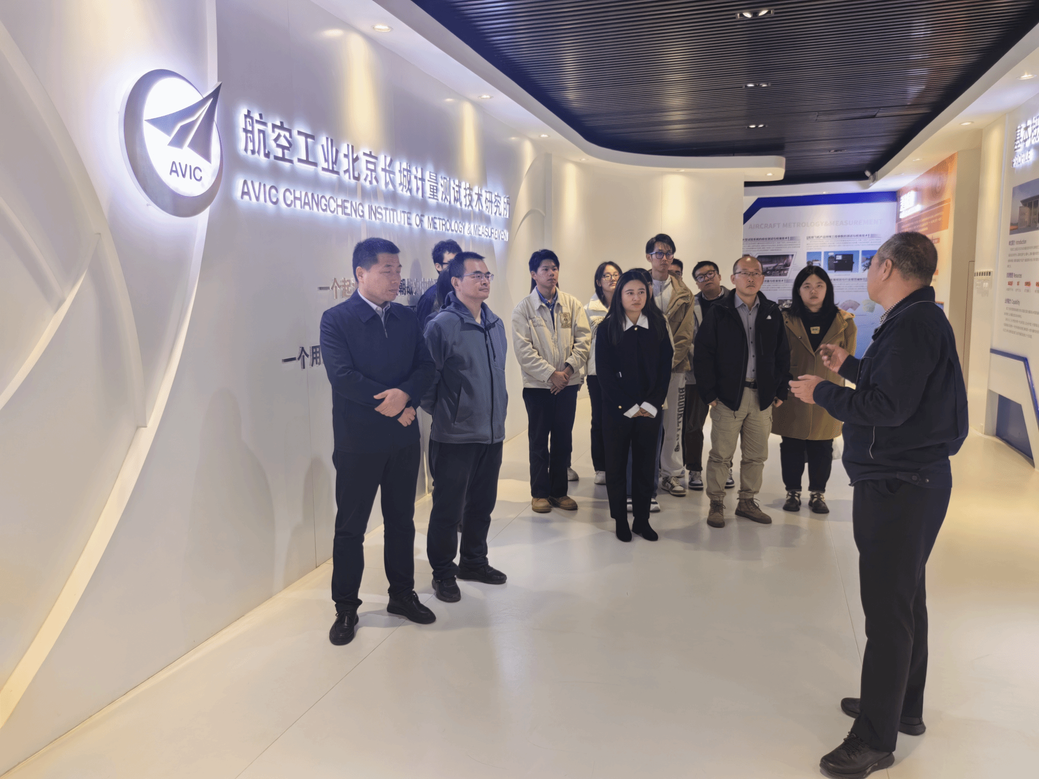 当天下午,学院一行到访航空工业集团计量所。同学们首先观看了计量所的宣传视频,深刻感受到计量所对重大工程项目提供的精确计量技术支持。随后,参观了计量所的展厅与生产线,不仅了解了计量所的定位发展以及为国防事业做出的巨大贡献,更是在现场感受到了高精度技术领域的严谨与专业。通过与计量所工作人员的交流,学生们对该领域的技术创新和发展潜力有了更深刻的理解。同学们表示,此次参访极大地拓宽了他们的视野,也激发了他们对未来职业选择的兴趣和思考。