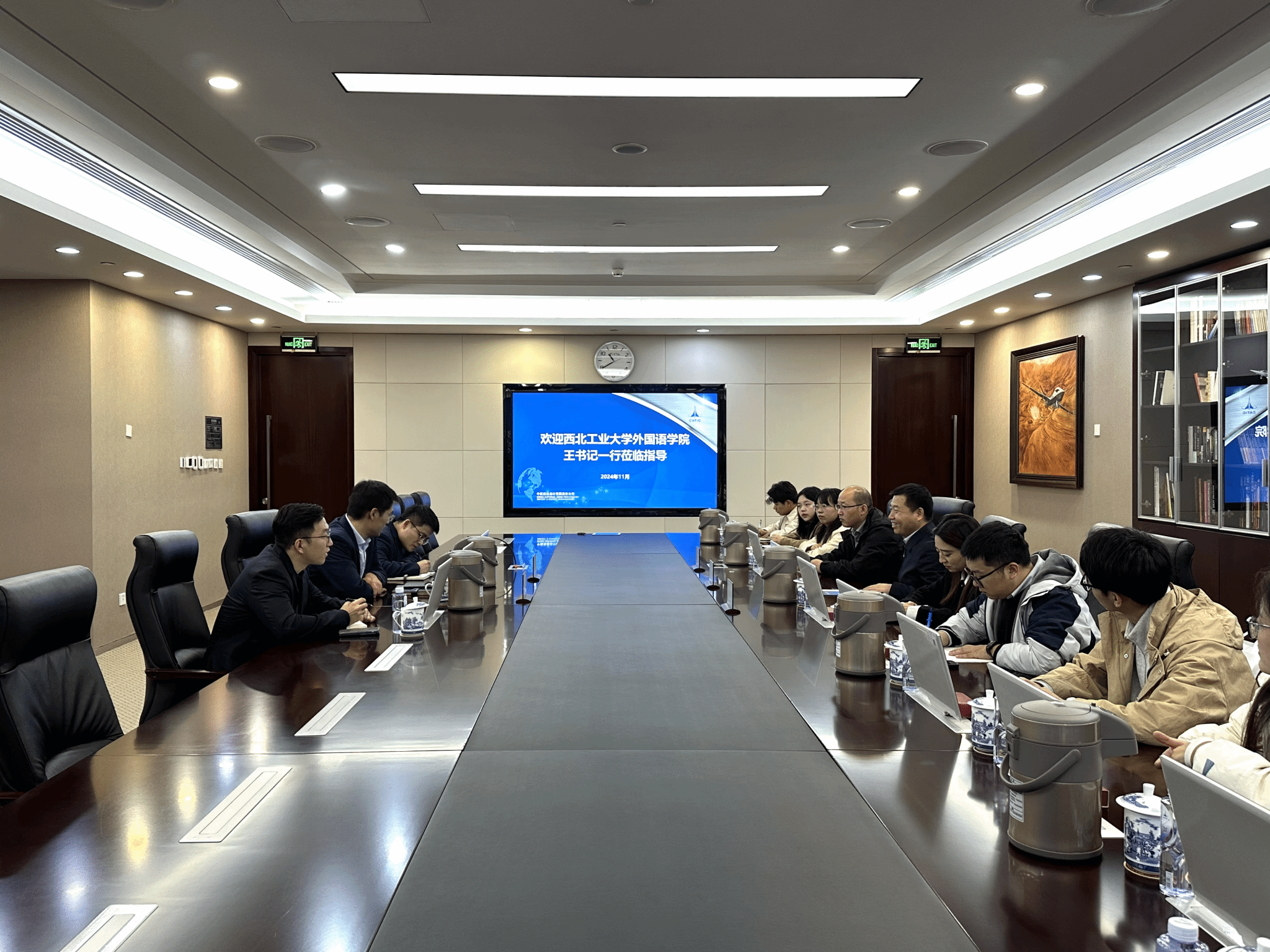 11日上午,王高祖一行参访了中航技进出口有限责任公司。首先在讲解员的带领下观看了“枭龙”宣传片并参观了公司展厅,深入了解了中航技在行业领域中的领先地位。随后,学院与中航技人力资源部部长周锋、人力资源部业务经理匡佳伟、武旭阳进行了座谈交流。匡佳伟简要介绍了公司历史、发展脉络、业务定位和未来发展方向等方面。周锋强调了中航技与西工大的长期合作背景,并展望了未来可能的深度合作,同时就每年的招聘情况以及实习情况进行了介绍。