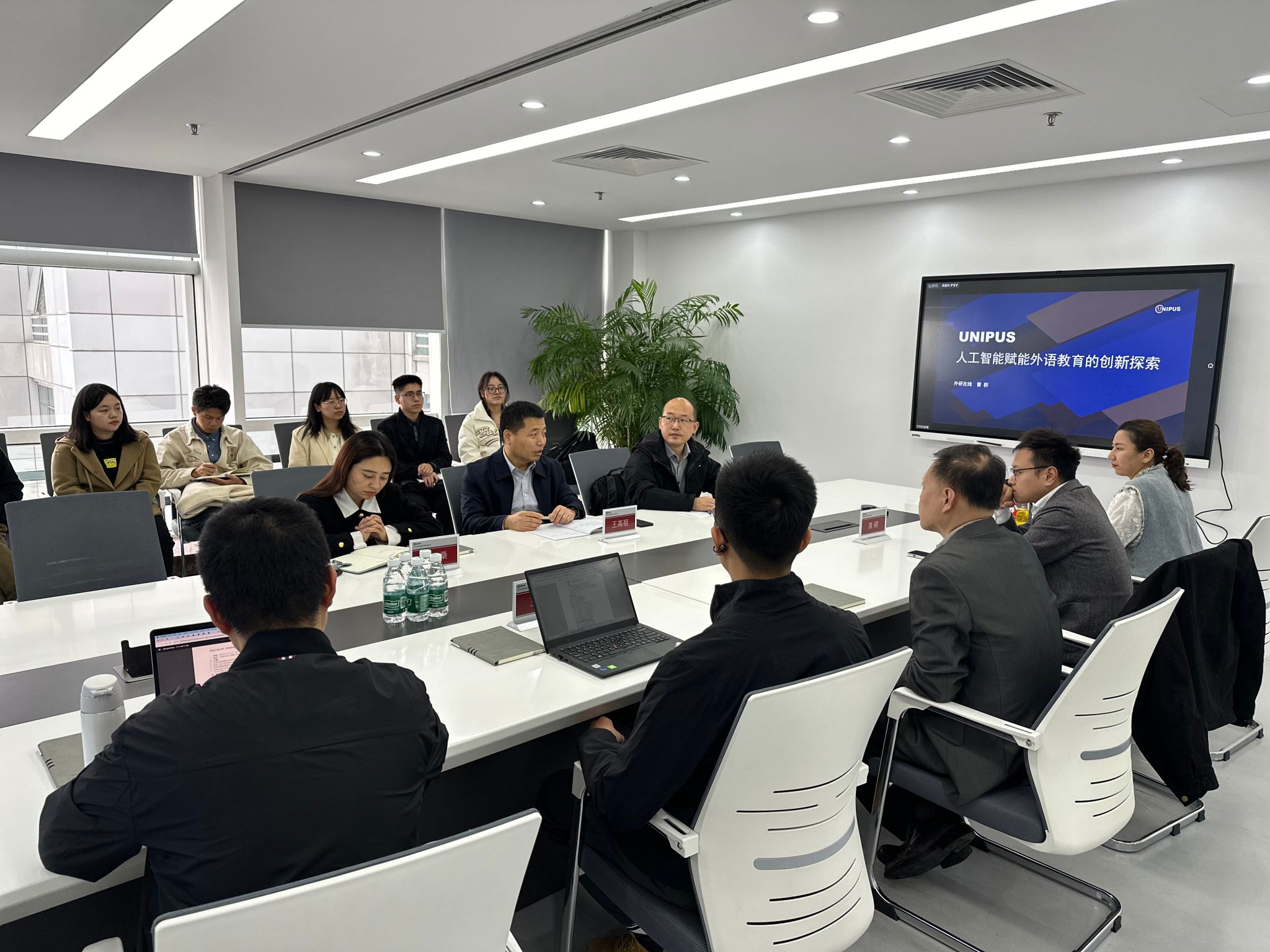 王高祖首先感谢了外研在线长期以来为学院提供的丰富课程资源和教学支持,并表达了对未来双方继续加强合作、推动学生发展和创新教育模式的美好愿景。随后曹群以“人工智能赋能外语教育的创新探索”为主题,详细介绍了外研在线在数字素质教育领域的实践与探索。最后,与会嘉宾就教学产品效果评估及其对学生综合技能培养等问题展开了深入讨论,进一步加强了双方在教育科技与人才培养方面的共识。