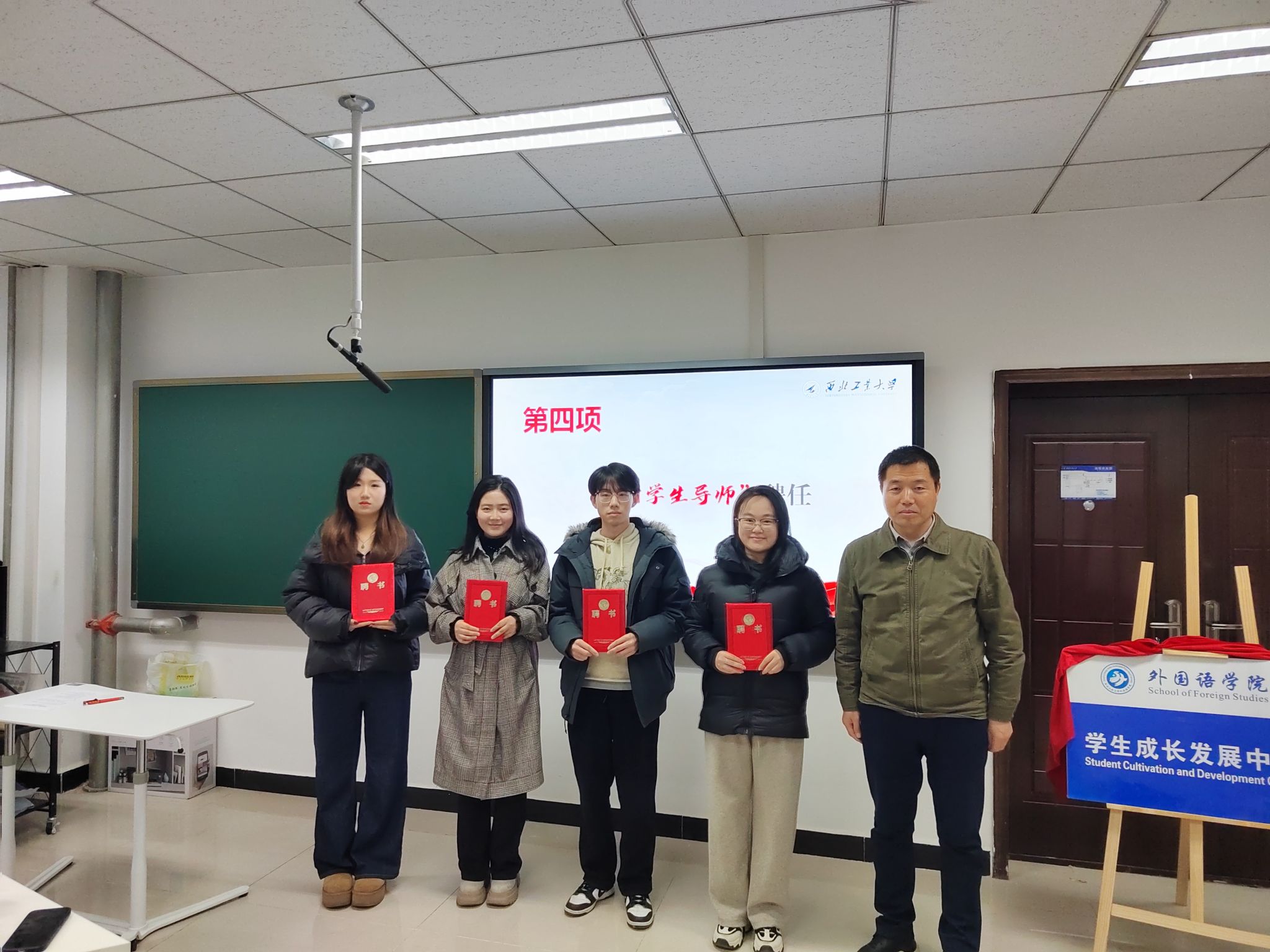 在聘任环节,张桑桑为“中心”的运维负责人李晨菲同学颁发聘书。运维负责人主要负责中心的日常管理与运营工作,并依托“中心”为学院师生提供服务。随后,王高祖为“助研学生导师”颁发聘书。助研学生导师是“中心”工作的重要内容之一,主要由研一考研上岸的学生担任,为每年大四报考本院研究生的同学提供学业帮扶。今年樱花动漫