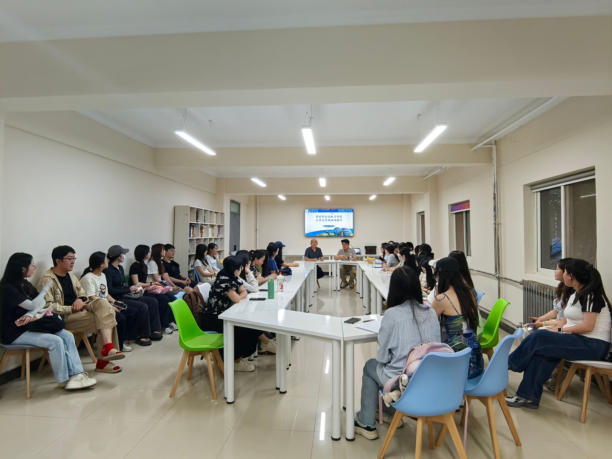 就职于中兴通讯的2020届外国语言学及应用语言学专业优秀研究生校友罗翔宇,围绕“探索职业适配与热爱,以多元思维破局前行”进行交流。辅导员赵青及40余名硕士研究生参加。