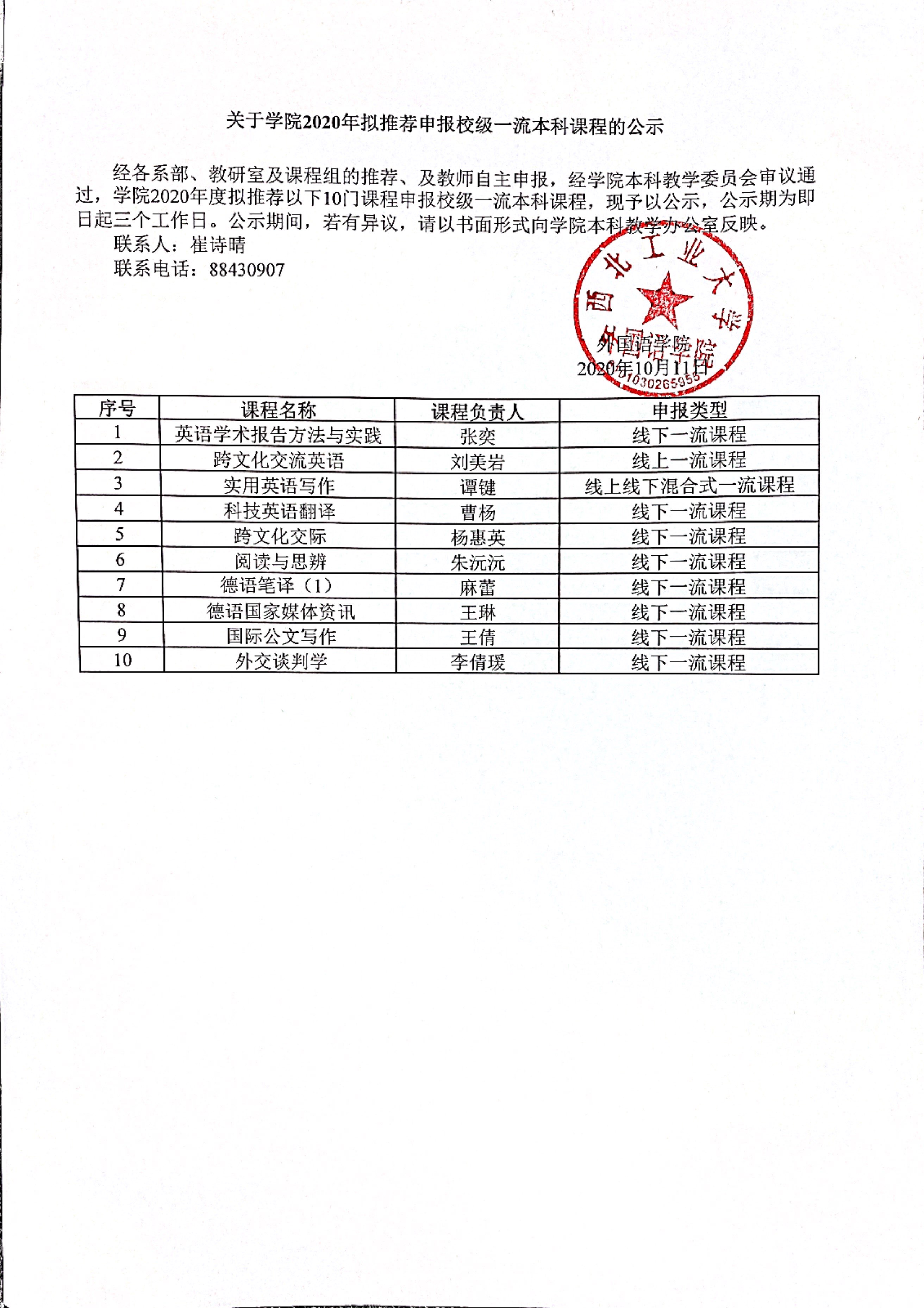 关于学院2020年拟推荐申报校级一流本科课程的公示